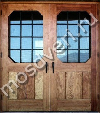Дверь парадная с отделкой вагонкой, стеклом и кованой решеткой в Медыни